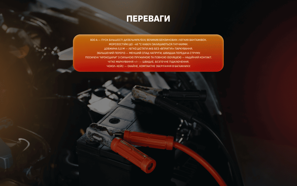 Тримайте дроти подалі від гарячих/рухомих частин; не використовуйте пошкоджені АКБ/кабелі; не змішуйте 12 В і 24 В; гібриди/EV «прикурювати» лише за інструкцією виробника.