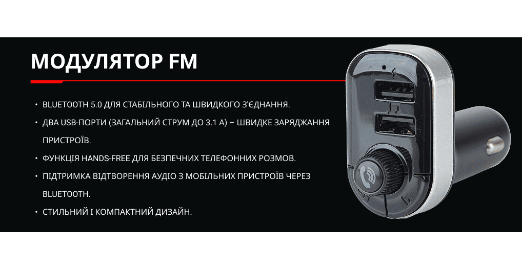 Модулятор FM-модулятор VOIN W-3307 – практичний пристрій, що поєднує функції зарядки, аудіоплеєра та бездротової гарнітури для безпечного спілкування по телефону в автомобілі. Модулятор підтримує живлення від прикурювача 12–24 В, сумісний із легковими та вантажними автомобілями. Оснащений двома USB-портами з сумарною силою струму 3.1 А, що дозволяє одночасно заряджати два гаджети.
