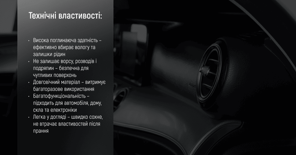 - Салон: протирання панелей, глянцю та мультимедіа — засіб наносити на ганчірку, не на поверхню.