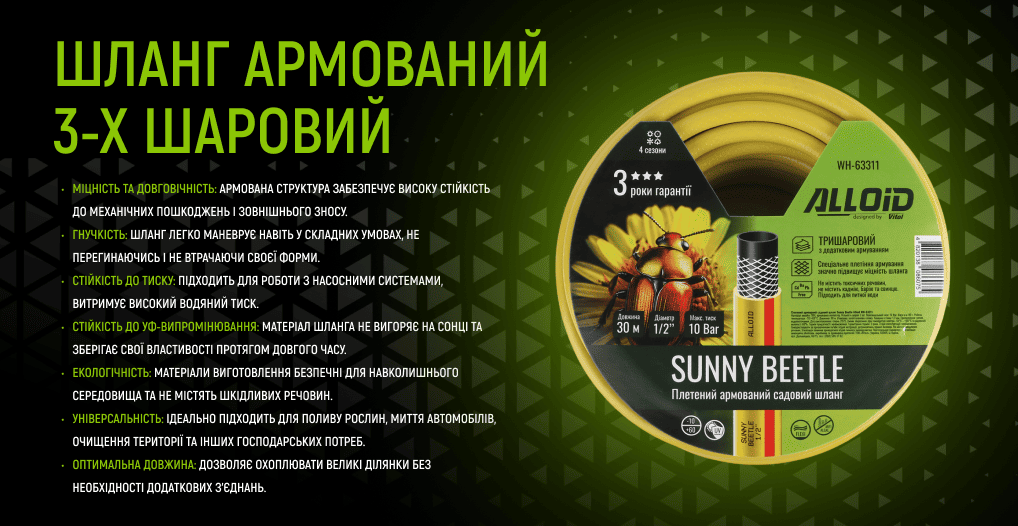 Шланг армований 3-х шаровий, "Sunny Beetle" 1/2" 30м. Alloid та інші товари ви можете придбати ОПТом та в РОЗДРІБ і замовити доставку по всій Україні у нашому інтернет-магазині аксесуарів та інструменту для автомобіля vitol.com.ua.
