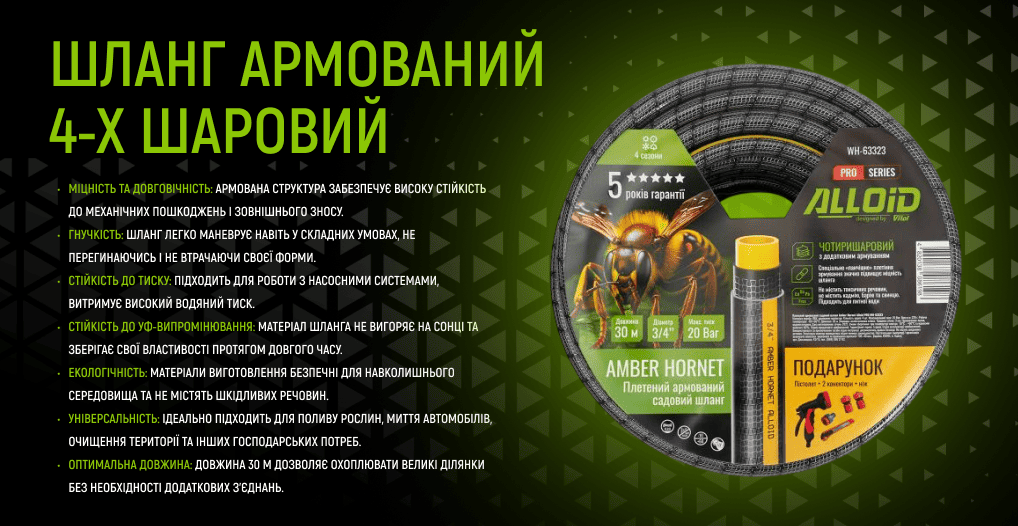 Шланг армований 4-х шаровий, "Amber Hornett" 3/4" 30 м + подарунок пістолет, 2 конектори, адаптор і ніж, Alloid Pro та інші товари ви можете придбати ОПТом та в РОЗДРІБ і замовити доставку по всій Україні у нашому інтернет-магазині аксесуарів та інструменту для автомобіля vitol.com.ua.