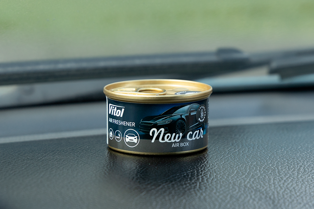 Vitol Air Box New Car — це ароматизатор у металевій банці з класичним ароматом нової машини. Ідеальне рішення для автомобілістів та поціновувачів чистоти, які хочуть відчути дух нового салону у будь-якому просторі. Простий у використанні, підходить для дому, офісу, гардеробу чи салону краси.