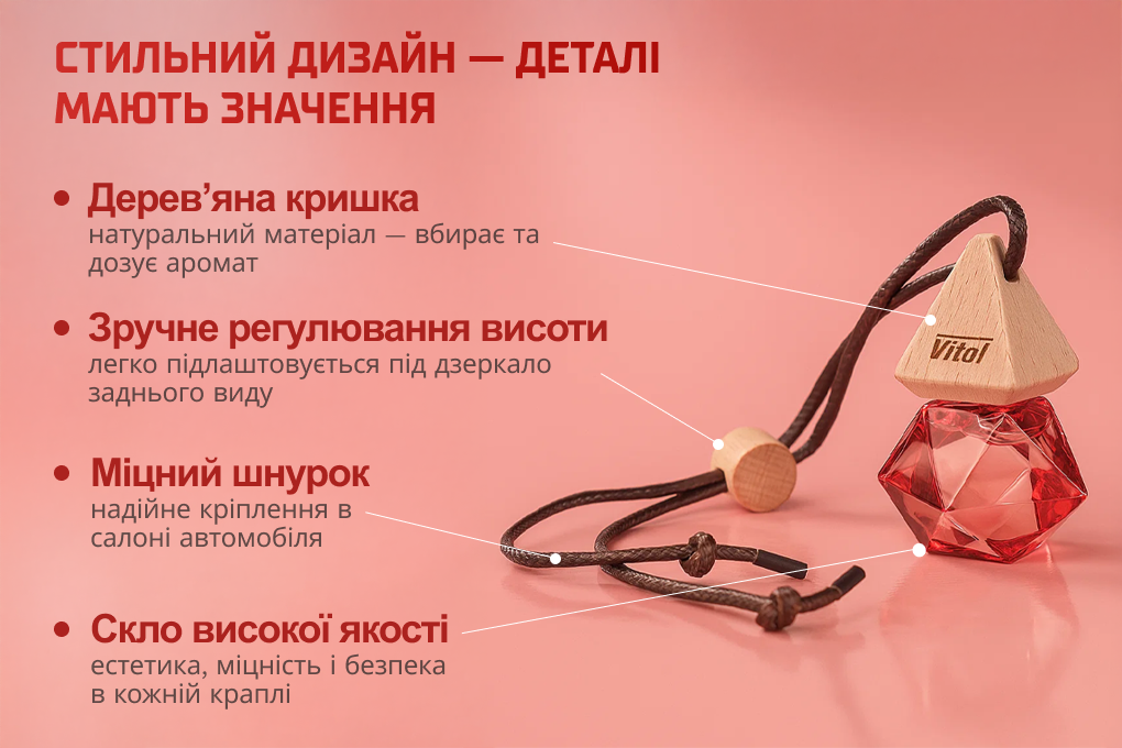 Кришечка з натурального дерева не лише прикрашає флакон, а й посилює аромат, рівномірно розподіляючи його у повітрі. Стильний кристальний флакон з вишуканим дизайном стане окрасою будь-якого інтер’єру — вдома, в офісі чи в авто.