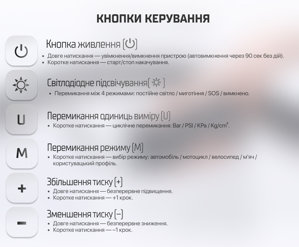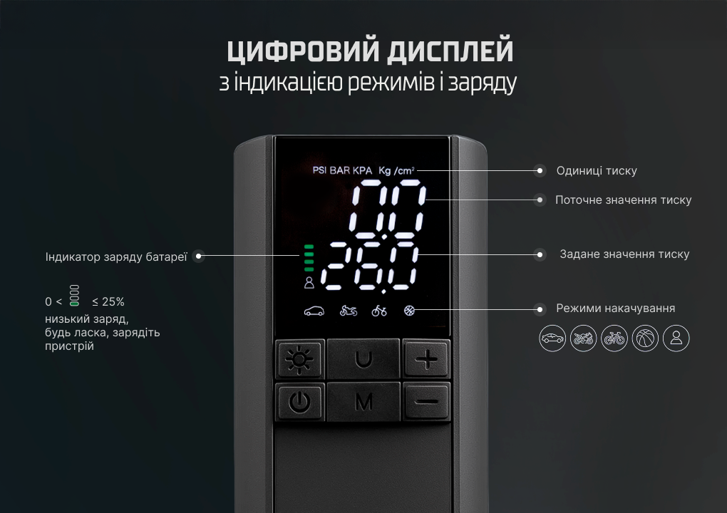 На екрані відображаються одиниці тиску, поточне та задане значення, а також режими накачування для авто, мотоцикла, велосипеда та м’ячів.