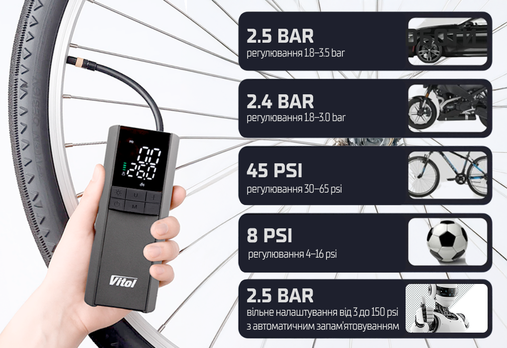 Автокомпресор Vitol K-35 3в1 має 5 вбудованих режимів, завдяки чому підходить для накачування шин автомобіля, мотоцикла, велосипеда, спортивних м’ячів та інших об’єктів.