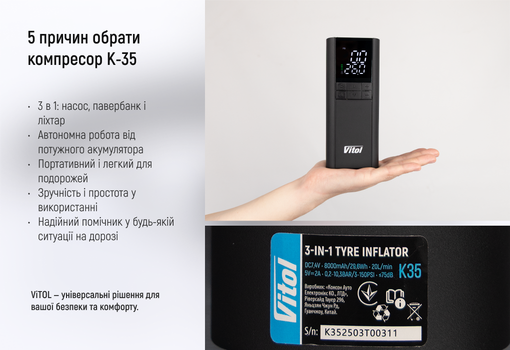 Автокомпресор Vitol K-35 3в1 — це сучасний багатофункціональний пристрій із зручним LED-дисплеєм та простим управлінням.