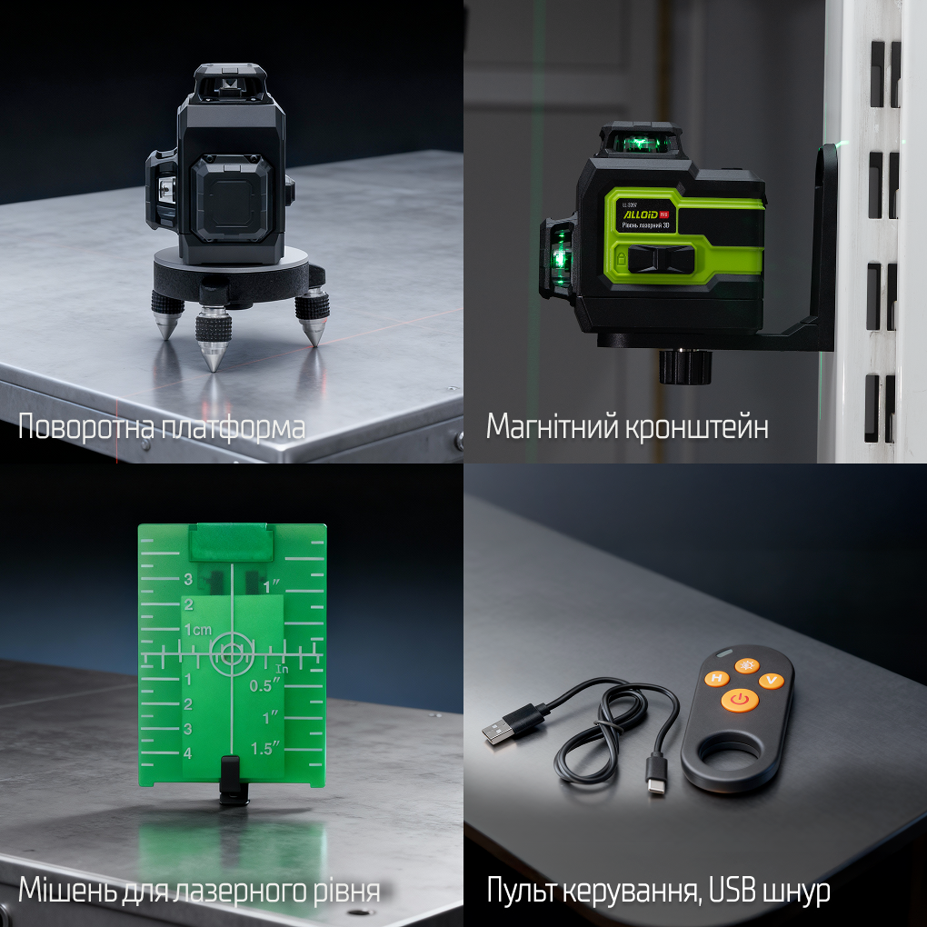 Лазерний рівень Alloid Pro LL-3397-K (3D) проєктує 4 площини на 360° — одну горизонтальну та три вертикальні. Це створює 12 яскравих ліній, які формують точну просторову сітку для ідеальної розмітки в будь-якому напрямку.