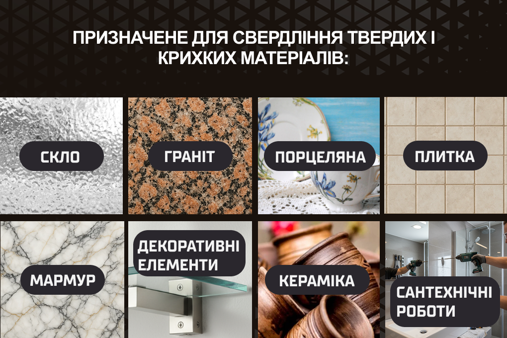 Ідеально підходять для роботи зі склом, керамікою, порцеляною, мармуром, плиткою, гранітом і декоративними елементами.