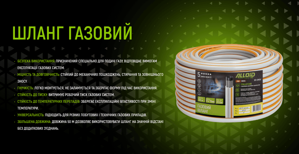 Шланг газовий 9×15 мм, довжиною 50 м, серія Alloid — це надійний та безпечний шланг для подачі побутового та технічного газу, який поєднує міцність, гнучкість і стійкість до тиску. Завдяки спеціальній газостійкій конструкції шланг забезпечує стабільну подачу газу без втрат і витоків, що робить його оптимальним вибором для використання в побуті, майстернях і технічних системах.