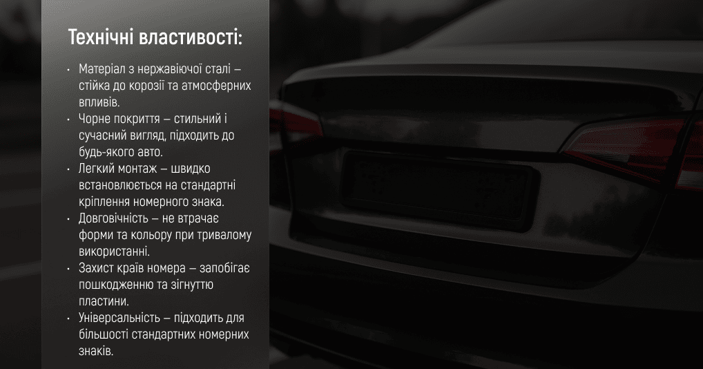 Дана рамка підходить для всіх видів автомобілів завдяки стандартними розмірами і стриманій формі. Автомобільна рамка виконана в чорному кольорі, вона відмінно підкреслить дизайн автомобіля.