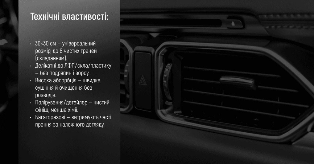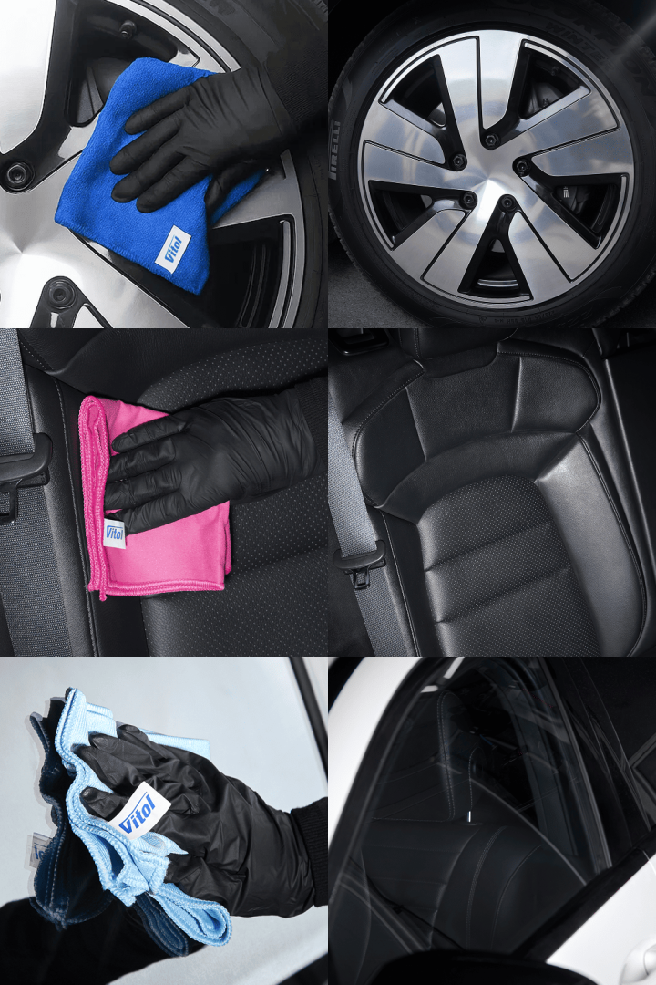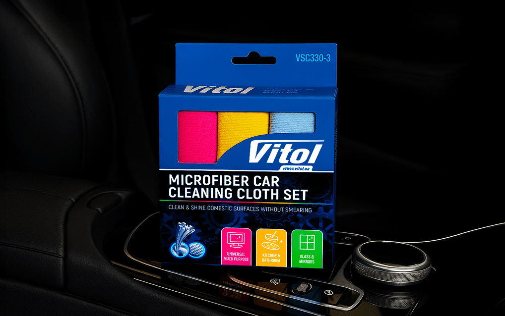 Набір ганчірок з мікрофібри від ТМ Vitol - краще рішення для очищення й полірування пластикових деталей всередині салону авто, а також для дзеркал, стекол, фар, колісних дисків і навіть для меблів.