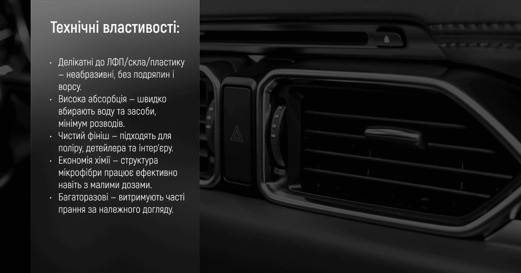 - Не застосовуйте з абразивними пастами чи агресивною хімією, не призначеною для мікрофібри.