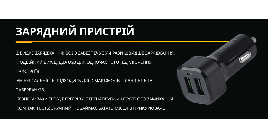 - Вхідна напруга: 12/24 В — підходить для легкових автомобілів і вантажівок.