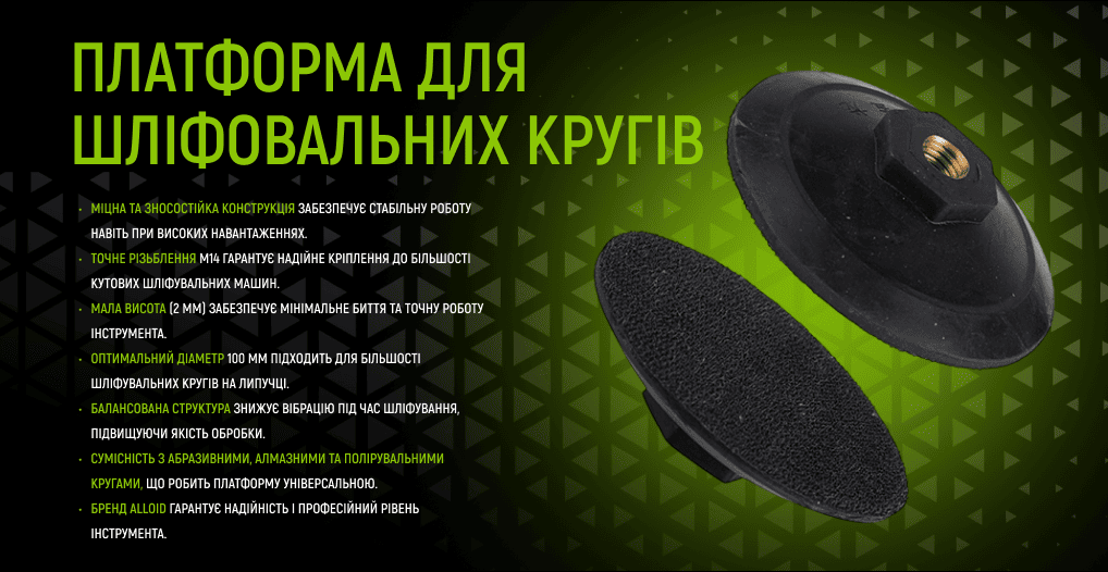 Платформа Alloid призначена для надійної фіксації шліфувальних кругів діаметром 100 мм. Ідеально підходить для використання з кутовими шліфувальними машинами (КШМ) та іншими інструментами з різьбленням М14х2 мм.