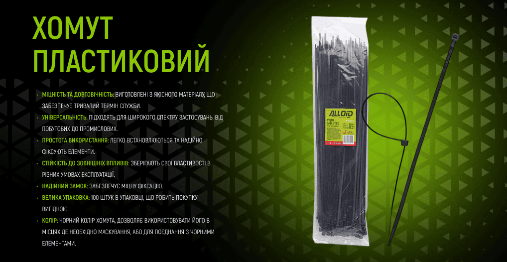 Хомут пластиковий Alloid 4.8 х 400 мм, 100 шт./уп., чорний – це універсальний та надійний інструмент для фіксації та стягування кабелів, проводів, труб та інших елементів.