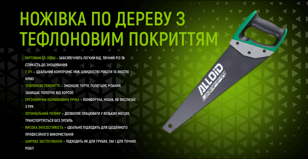 Ножівка Alloid 400 мм — це поєднання компактності, ергономіки та високої продуктивності. Завдяки загартованим 3D зубцям, антикорозійному тефлоновому покриттю та зручній комбінованій ручці, інструмент призначений для точного, чистого і комфортного різання деревини та подібних матеріалів. Підходить як для професійного використання у будівництві, так і для побутових задач у домашніх умовах або на дачі.