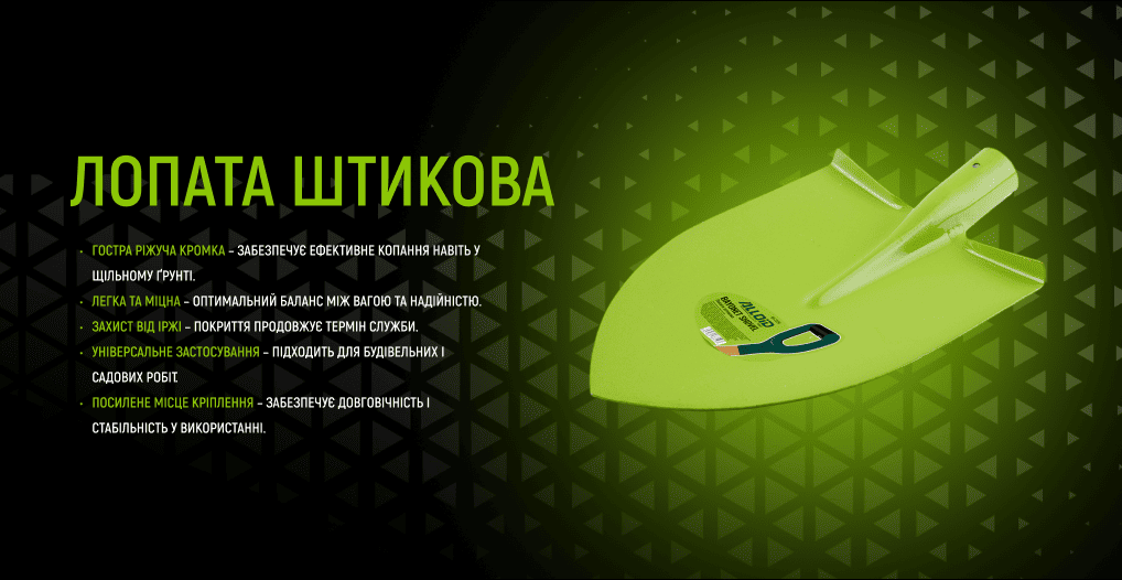 - Особливості: міцне полотно, стійкість до навантажень, зручна форма для легкого проникнення в землю