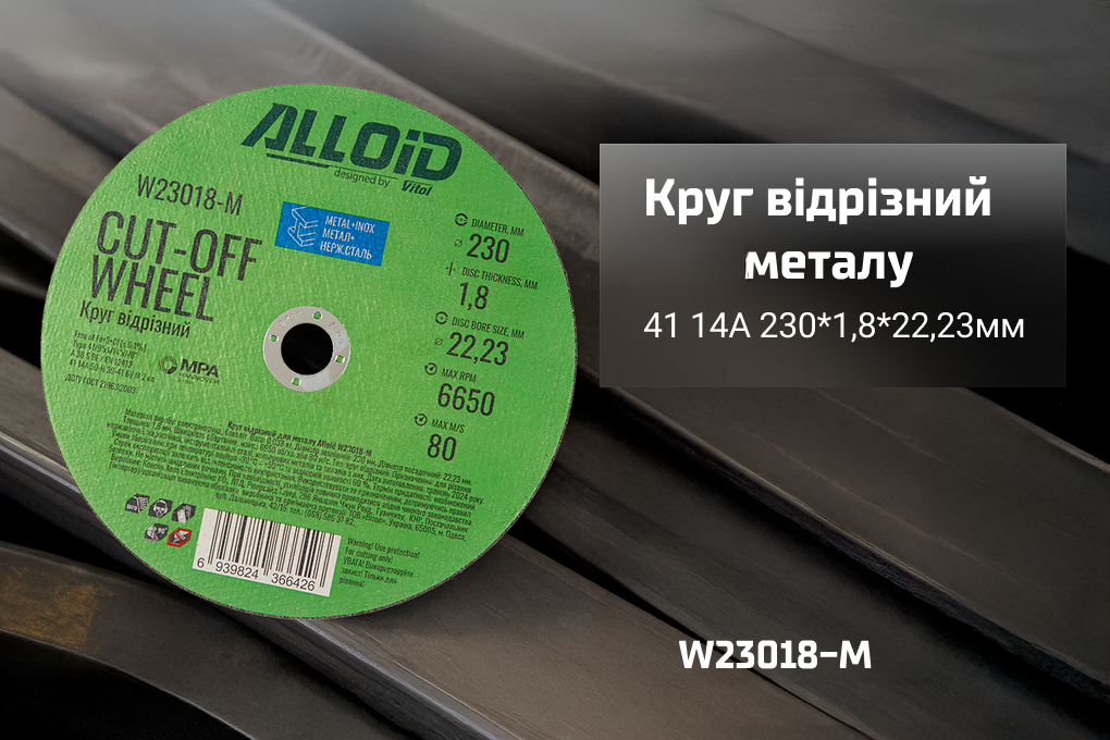 Відрізний круг Alloid W23018-M діаметром 230 мм і товщиною 1,8 мм призначений для роботи з чорними металами та нержавіючою сталлю.
