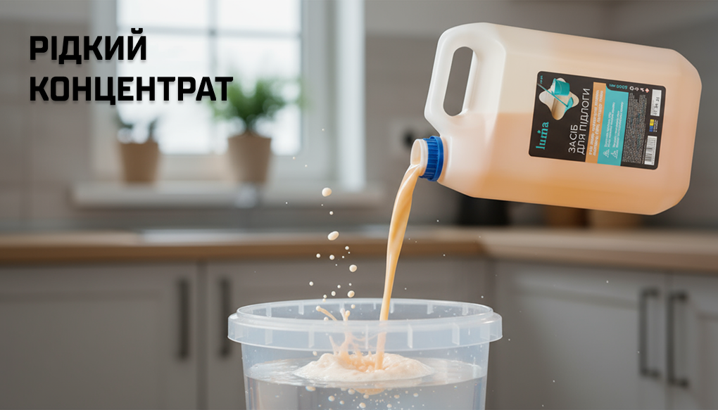 Розведіть концентрат у теплій воді згідно з рекомендаціями на упаковці (зазвичай 30–50 мл засобу на 5 літрів води).