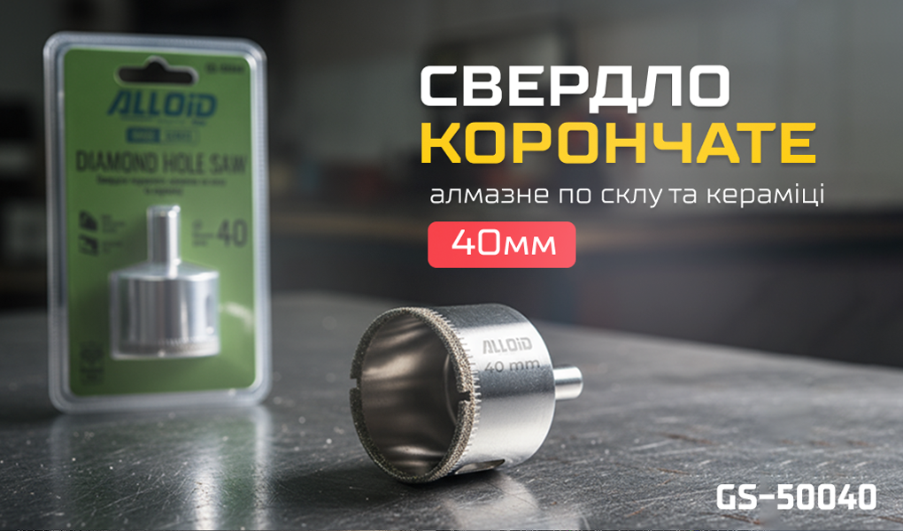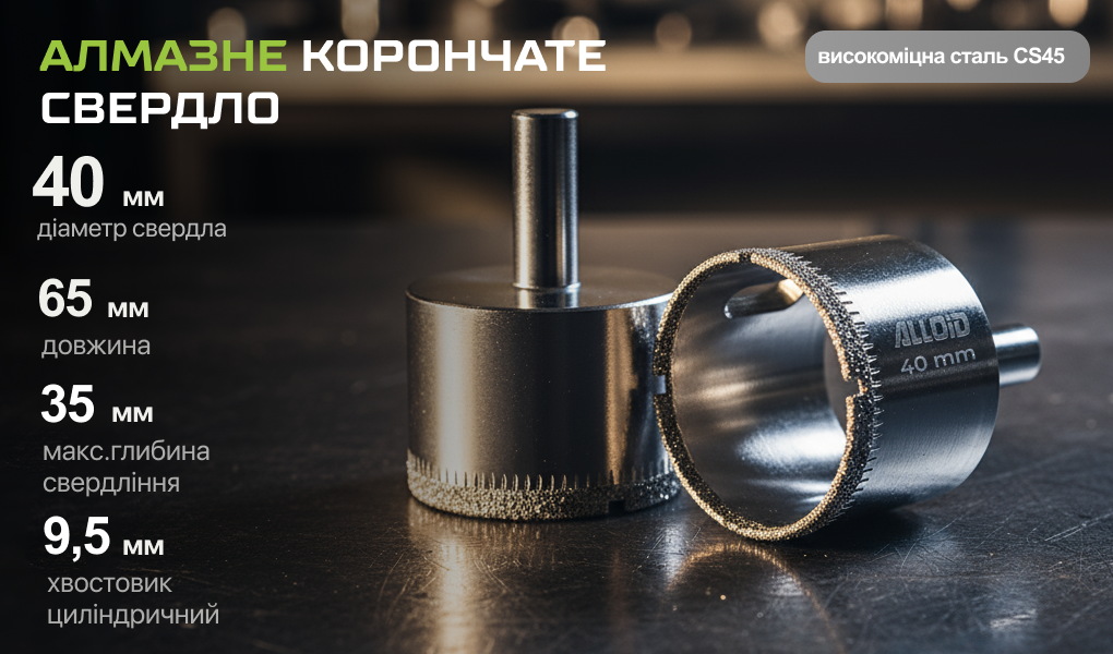Alloid Base Ø40 мм — професійне алмазне корончате свердло для точного свердління скла, кераміки, плитки, порцеляни, мармуру, граніту та інших твердих матеріалів. Завдяки якісній алмазній ріжучій кромці забезпечує великий, рівний і чистий отвір без сколів та тріщин, що є критичним для сантехнічних та оздоблювальних робіт.