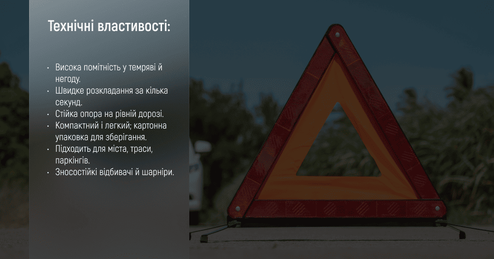 Знак аварійний ЗА 001 — це cкладний аварійний знак у формі світловідбивного трикутника для позначення зупинки транспортного засобу. Забезпечує помітність авто у темну пору доби та в умовах зниженої видимості. Постачається в компактній картонній упаковці для зручного зберігання в багажнику.