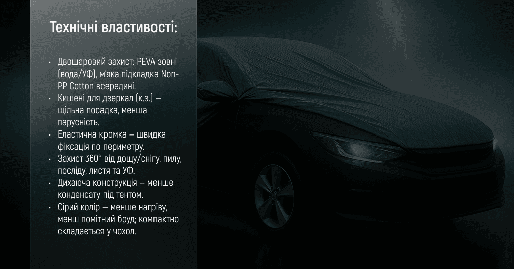 - PEVA (зовнішній шар): водостійкий, вітростійкий, з УФ-захистом.