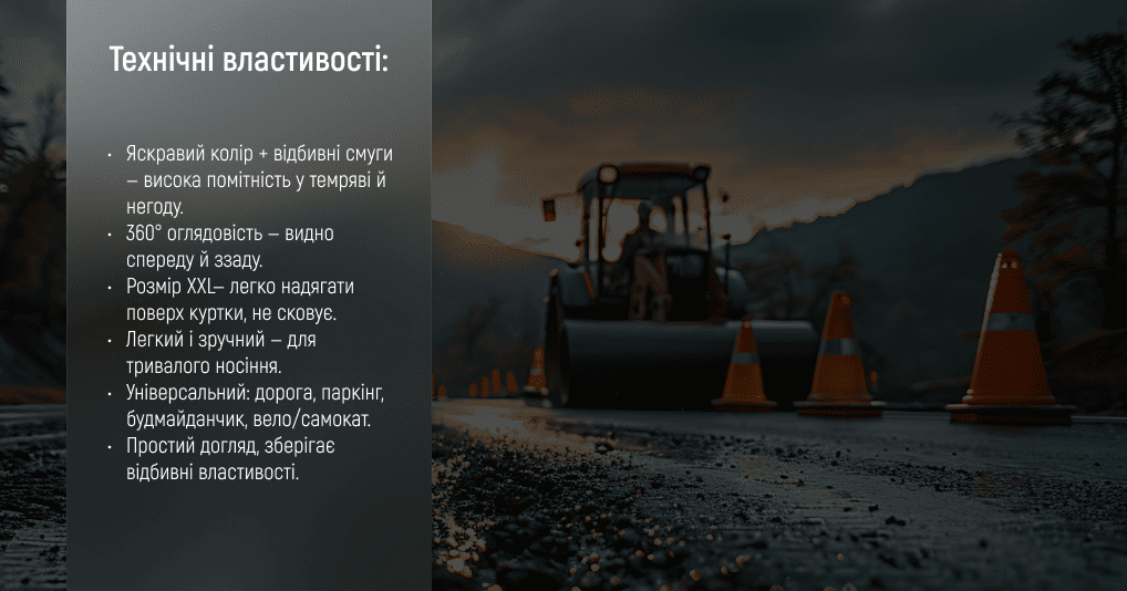 Яскравий і помітний жилет безпеки від компанії Vitol зробить присутність на проїжджій частині максимально помітним.