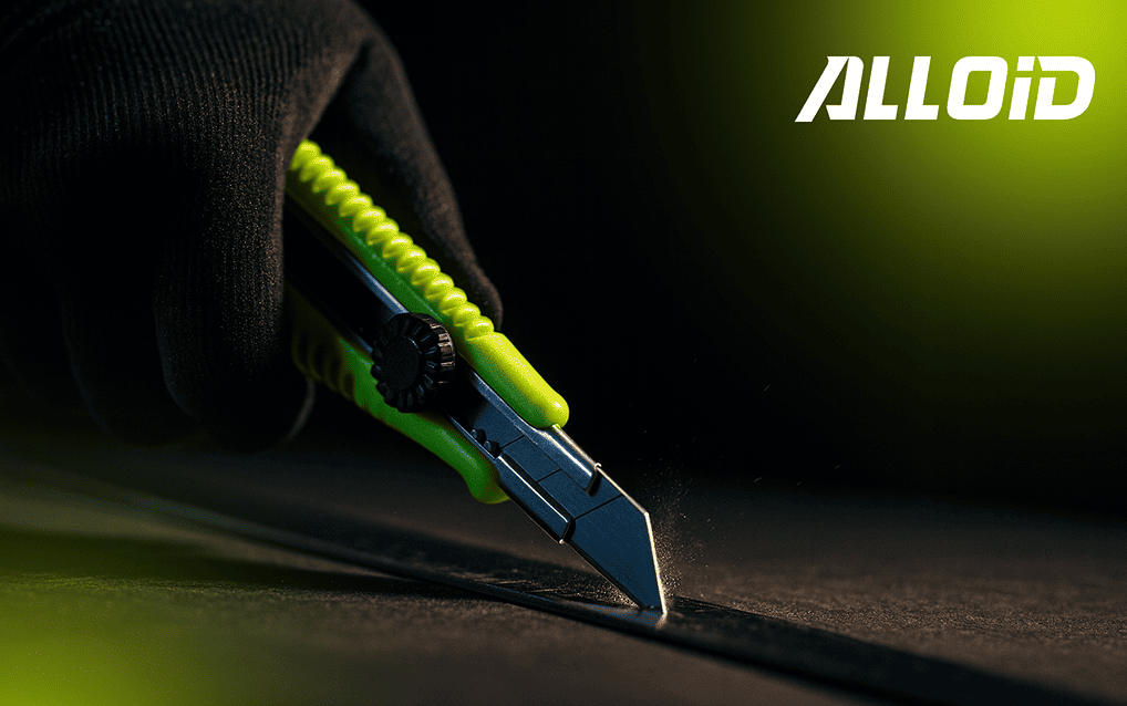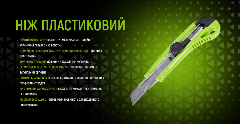 Ніж Alloid з висувним сегментним лезом 18 мм та гвинтовим фіксатором — надійний інструмент для точного різання різних матеріалів. Корпус виготовлений із міцного пластику, легкий і зручний у користуванні. Завдяки гвинтовому механізму фіксації, лезо надійно утримується в потрібному положенні навіть під час інтенсивного навантаження. Ідеально підходить для різання картону, шпалер, гуми, пластику, плівки та інших матеріалів.