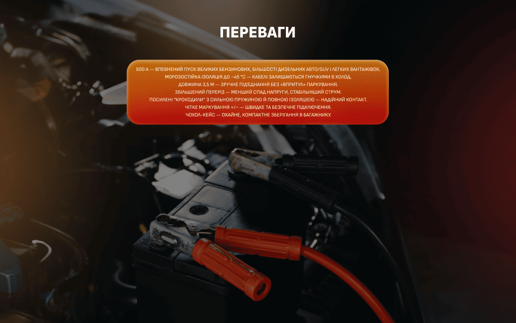 Пускові дроти Pulso виготовлені з високоякісних матеріалів, вони гнучкі й можуть працювати навіть при екстремальному морозі до -45С, зберігаючи еластичність. При цьому вони забезпечать передачу струму високої потужності майже без втрат.