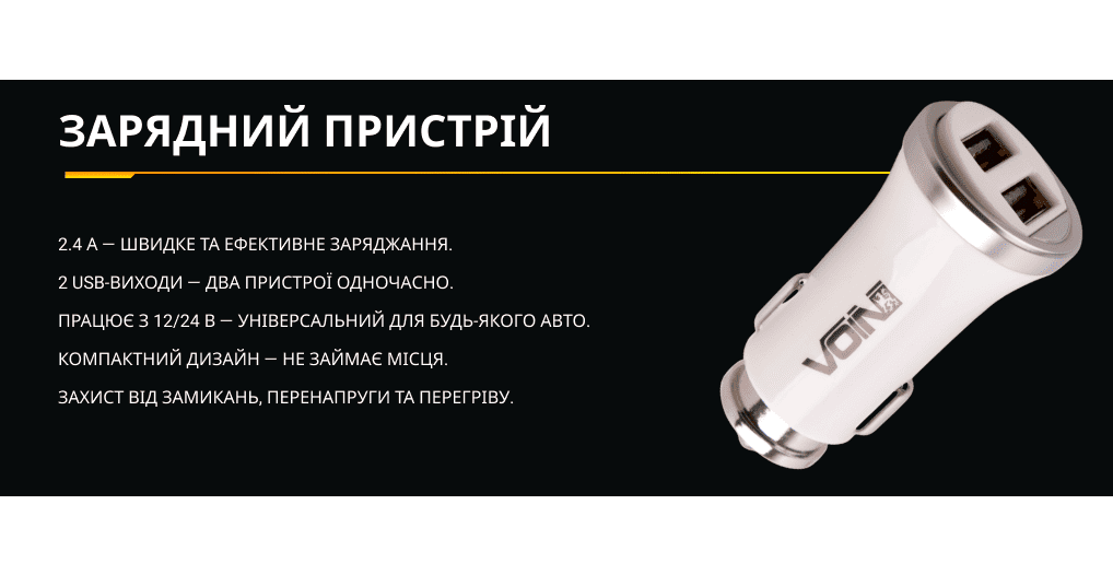 Автомобильное зарядное устройство VOIN C-2411W 2USB (12/24V - 5V 2,4A) и другие товары вы можете приобрести ОПТом и в РОЗНИЦУ и заказать доставку по всей Украине в нашем интернет-магазине аксессуаров и инструмента для автомобиля vitol.com.ua.