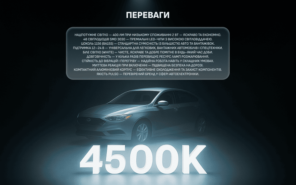Світлодіодна лампа PULSO 1156 (BA15s) P21W 48SMD-3030 – потужне та універсальне рішення для габаритних вогнів, поворотників і задніх ліхтарів автомобілів. Оснащена 48 високоефективними світлодіодами SMD-3030, що забезпечують інтенсивний світловий потік 400 люмен при мінімальному споживанні енергії (2 Вт). Працює в діапазоні напруг 12-24V, підходить як для легкових, так і для вантажних автомобілів.