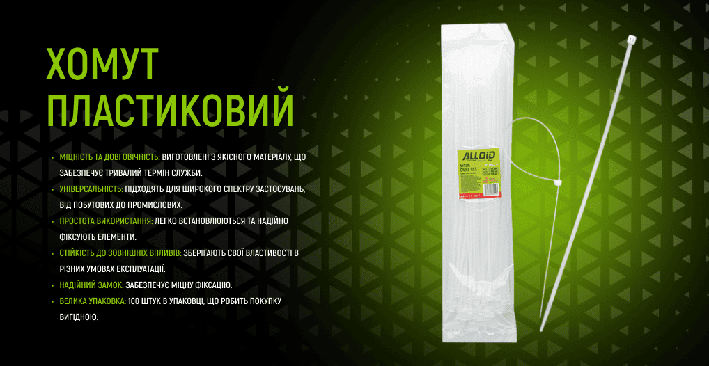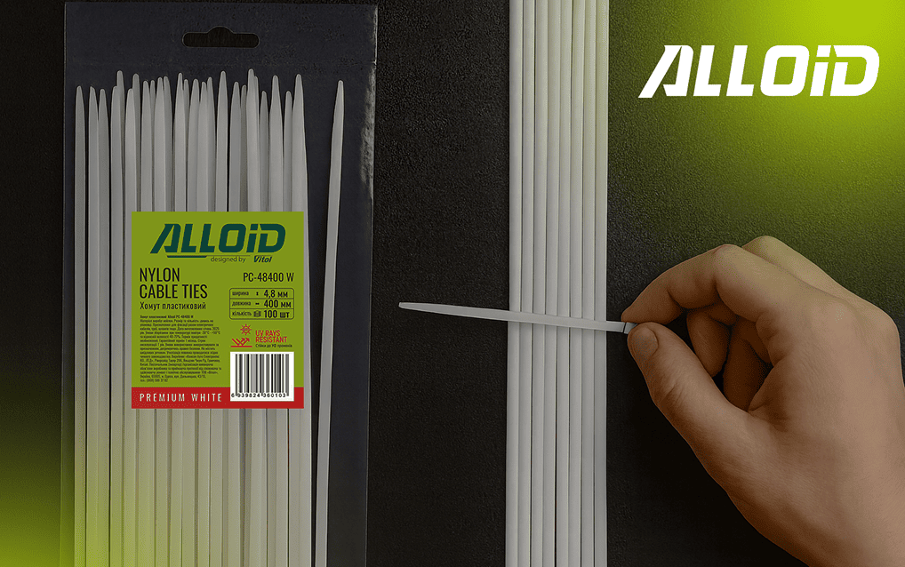 Хомут пластиковий Alloid 4.8 х 400 мм, 100 шт./уп., білий – це універсальний та надійний інструмент для фіксації та стягування кабелів, проводів, труб та інших елементів.