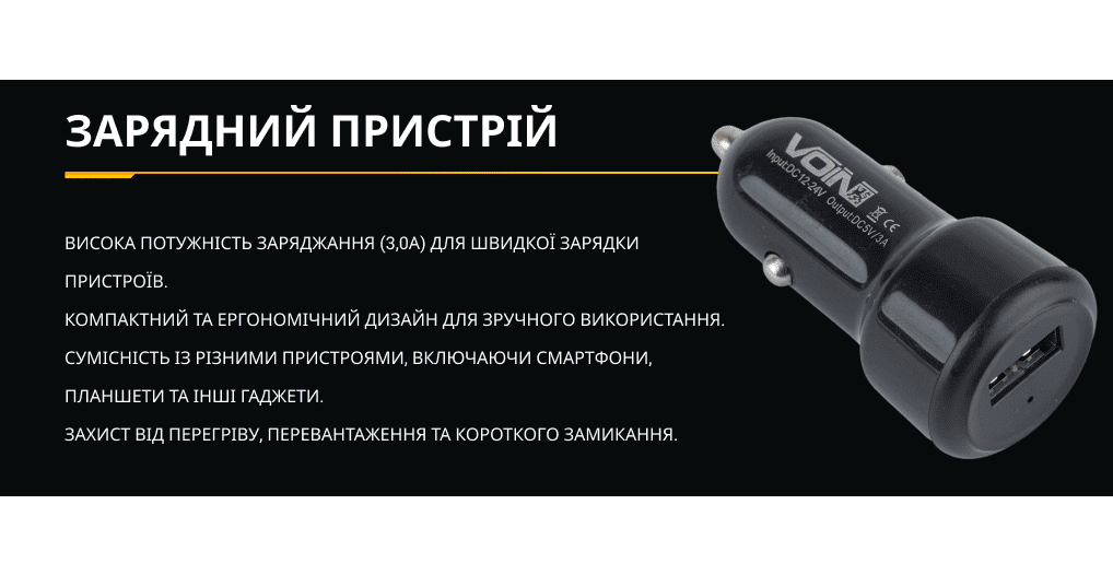 Автомобільний зарядний пристрій VOIN C-36209, 1USB (12/24V - 5V 3,0A) та інші товари ви можете придбати ОПТом та в РОЗДРІБ і замовити доставку по всій Україні у нашому інтернет-магазині аксесуарів та інструменту для автомобіля vitol.com.ua.