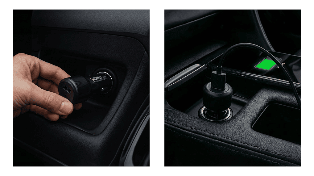 - Вставте зарядний пристрій VOIN у прикурювач автомобіля (12/24V).