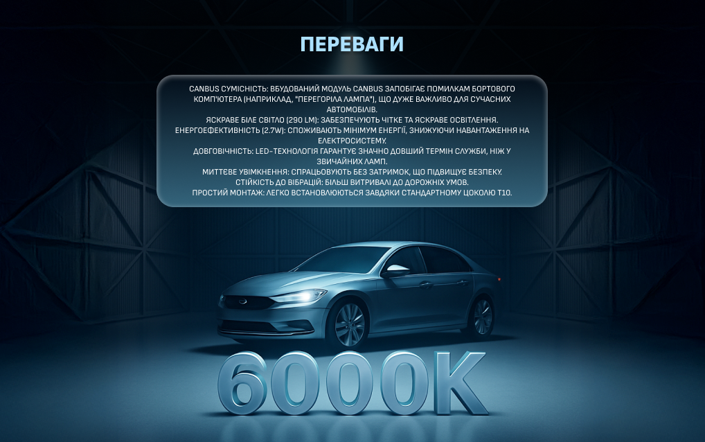 Застосування: габаритні вогні, підсвітка номера, освітлення салону