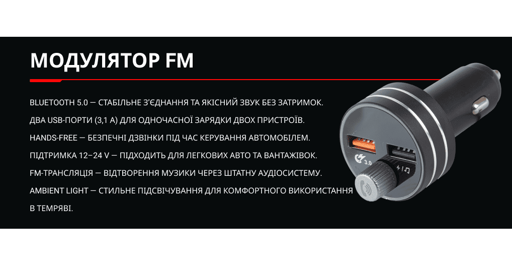 Модулятор FM, VOIN W-3301, 12-24V 2 USB 3,1A, Bluetooth 5.0, Hands-free, ambient light та інші товари ви можете придбати ОПТом та в РОЗДРІБ і замовити доставку по всій Україні у нашому інтернет-магазині аксесуарів та інструменту для автомобіля vitol.com.ua.