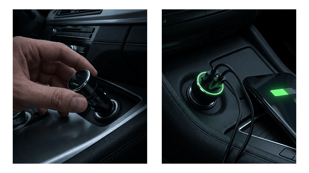 - Вставте зарядний пристрій VOIN у прикурювач автомобіля (12/24V).