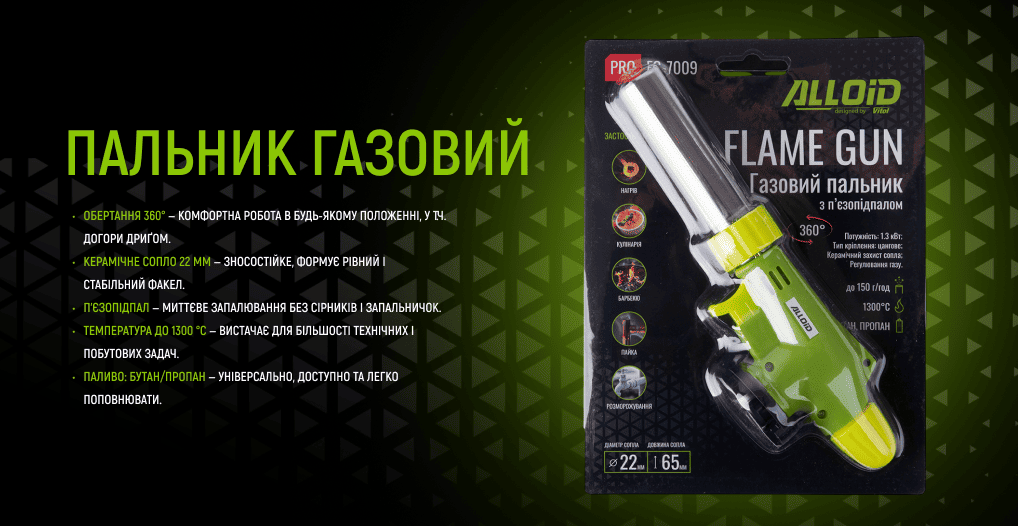 ПОТУЖНІ ГАЗОВІ ПАЛЬНИКИ від Alloid: ТЕСТ та ОГЛЯД всіх моделей!Газовий пальник Alloid Pro FG-7009 — це професійний інструмент нового покоління для побутових, туристичних і технічних завдань. Модель оснащена керамічним соплом діаметром 22 мм і підтримує обертання на 360°, що забезпечує універсальність та зручність у будь-якому положенні.