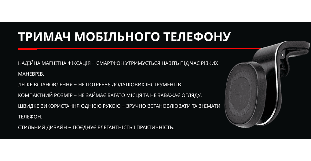 - Магнітна фіксація: забезпечує міцне утримання смартфона без додаткових затискачів.