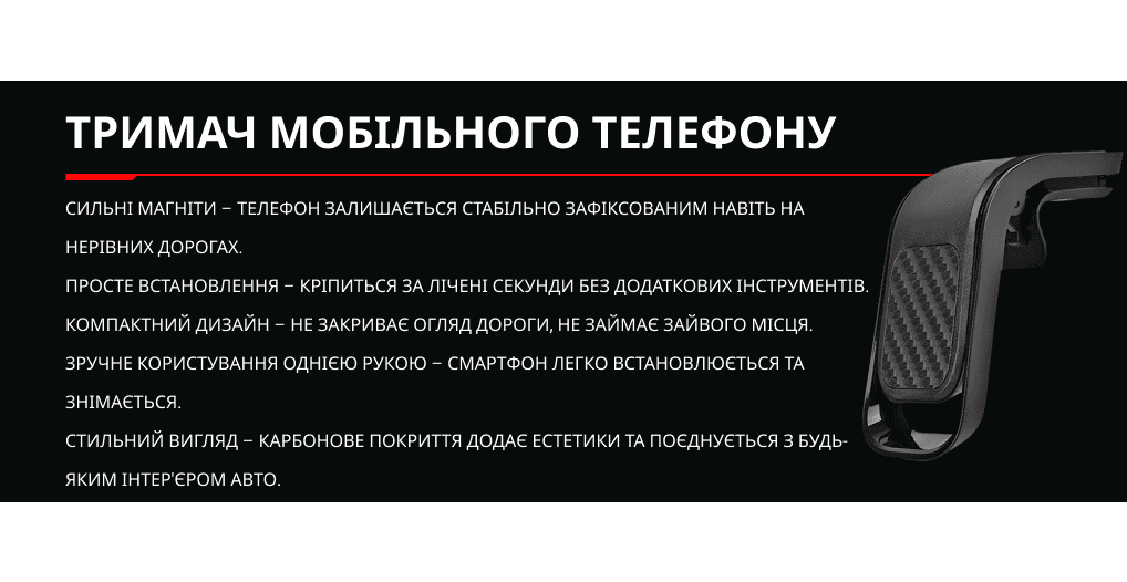 - Магнітна фіксація: утримує смартфон без додаткових затискачів.