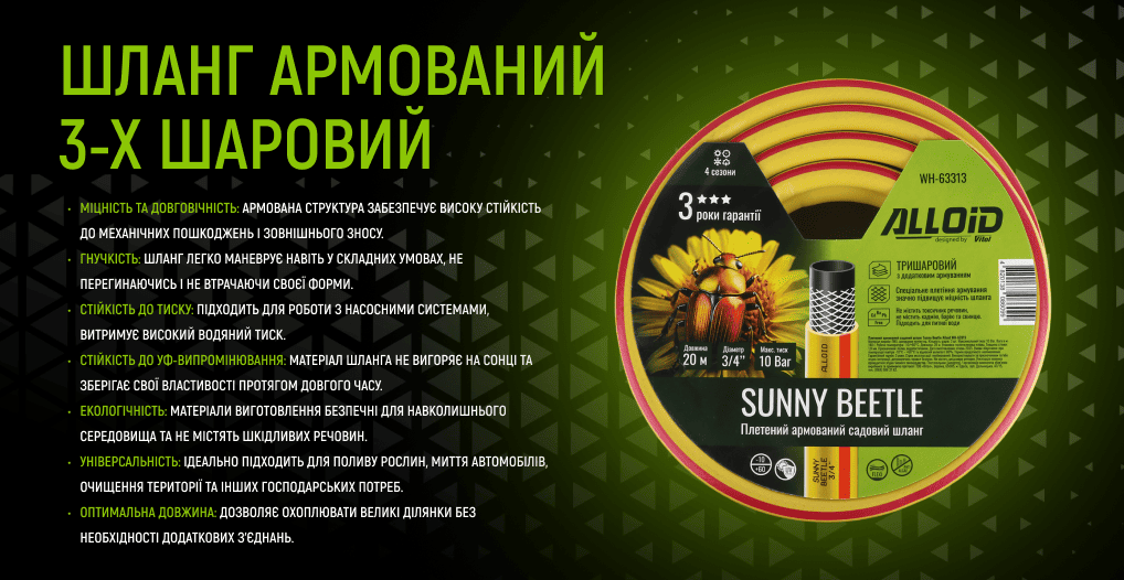 Шланг армований 3-х шаровий, "Sunny Beetle" 3/4" 20м. Alloid та інші товари ви можете придбати ОПТом та в РОЗДРІБ і замовити доставку по всій Україні у нашому інтернет-магазині аксесуарів та інструменту для автомобіля vitol.com.ua.