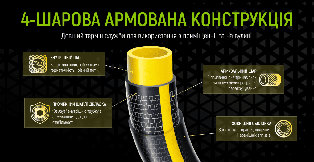Шланг армований 4-х шаровий, "Amber Hornett" 3/4" 50 м + подарунок пістолет, 2 конектори, адаптор і ніж, Alloid Pro та інші товари ви можете придбати ОПТом та в РОЗДРІБ і замовити доставку по всій Україні у нашому інтернет-магазині аксесуарів та інструменту для автомобіля vitol.com.ua.