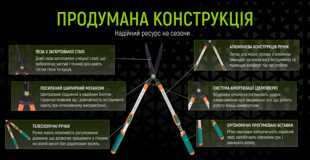 - Призначення: обрізка кущів і гілок середнього діаметра в саду та ландшафті