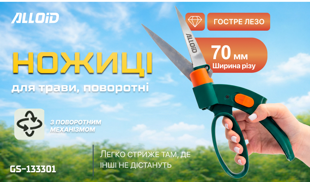 Садові ножиці Alloid GS-133301 — це зручний інструмент для точного підстригання трави у важкодоступних місцях. Завдяки поворотному механізму 360° ви легко дістанетесь туди, де не справляється тример.