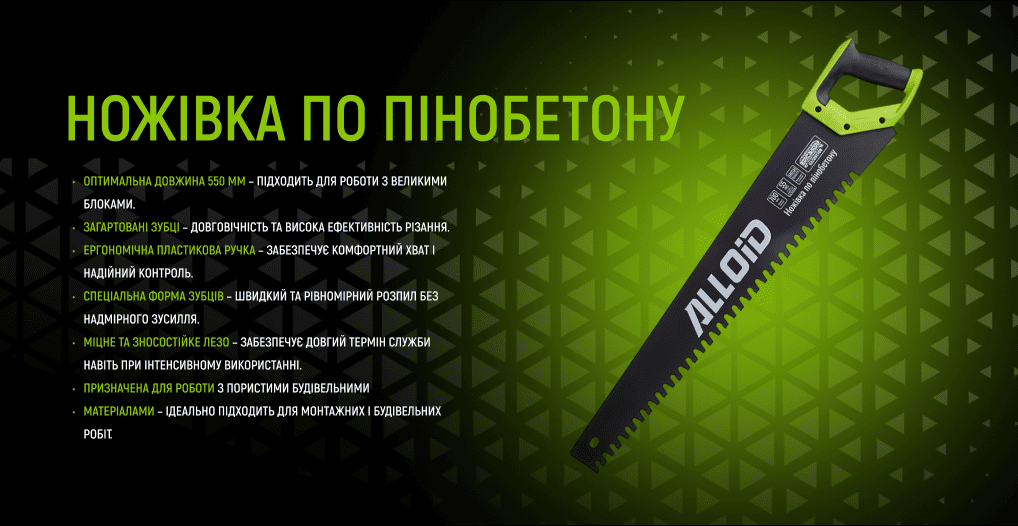 Ножівка Alloid 700 мм спеціально розроблена для роботи з пінобетоном, газобетоном та іншими пористими матеріалами. Великі зубці з загартованої сталі забезпечують швидке та чисте різання, а ергономічна пластикова ручка дозволяє комфортно працювати без зайвого навантаження на руки.