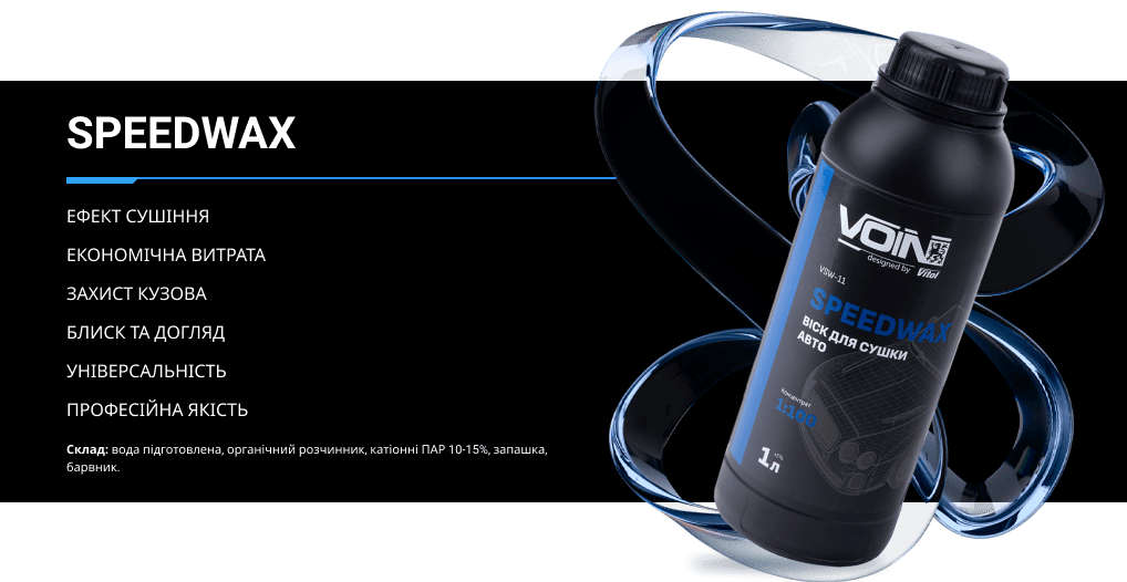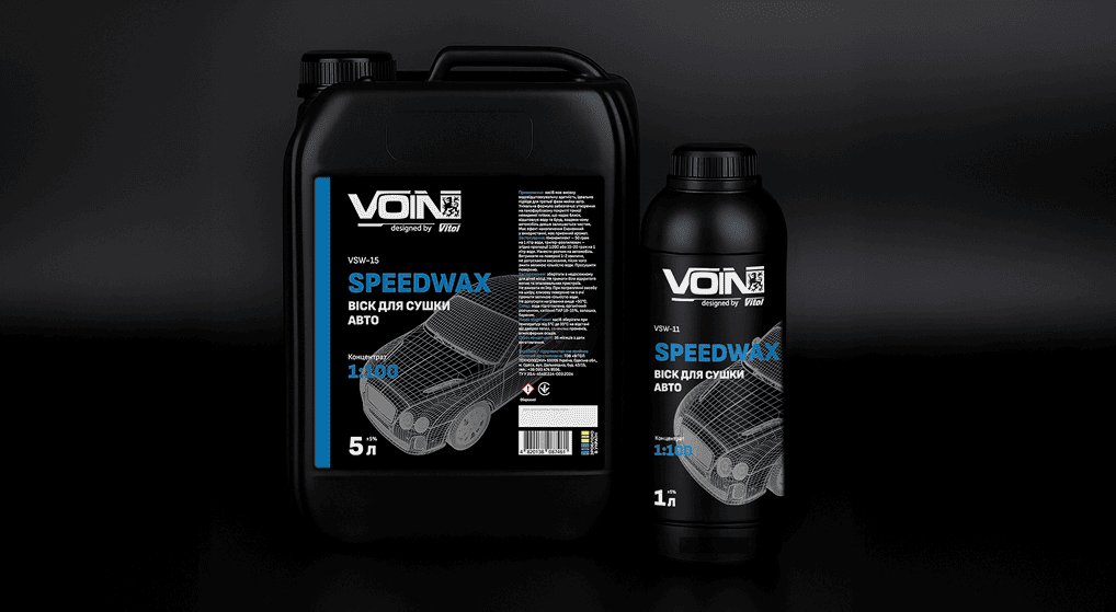 VOIN SpeedWax — öå âèñîêîÿê³ñíèé êîíöåíòðîâàíèé â³ñê äëÿ øâèäêîãî ñóø³ííÿ àâòîìîá³ëÿ ï³ñëÿ ìèòòÿ. Çàâäÿêè ôîðìóë³ 1:100, çàñ³á çàáåçïå÷óº ÷óäîâå âîäîâ³äøòîâõóâàííÿ, áëèñê òà àíòèñòàòè÷íèé åôåêò. ϳäõîäèòü äëÿ âèêîðèñòàííÿ íà âñ³õ òèïàõ ËÔÏ, ñêë³ òà ïëàñòèêó. Âèêîðèñòîâóºòüñÿ íà àâòîìèéêàõ, ó ïðîôåñ³éíîìó òà ïîáóòîâîìó äîãëÿä³ çà àâòî.