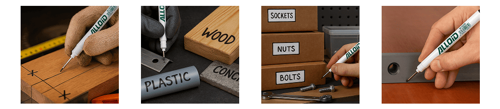 - Розмітка у важкодоступних місцях — отвори, стики, монтажні зони, де звичайний маркер не дістає.