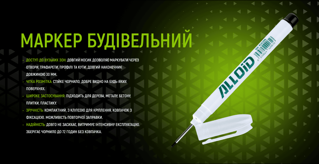 Будівельний маркер Alloid з довгим носиком — це точний і зручний інструмент для розмітки у важкодоступних місцях. Він ідеально підходить для свердлильних, монтажних, столярних і оздоблювальних робіт. Подовжений наконечник дозволяє наносити мітки через отвори, щілини, під кутом і в глибоких конструкціях, де звичайний маркер не справляється.