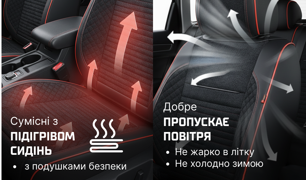 Чохли VOIN повністю сумісні з підігрівом сидінь та не перешкоджають роботі системи обігріву — тепло рівномірно проходить через матеріал, забезпечуючи комфорт у холодну пору року. Завдяки спеціальним швам чохли також безпечні для встановлення на сидіння з боковими подушками безпеки: Airbag легко спрацьовує у разі потреби.