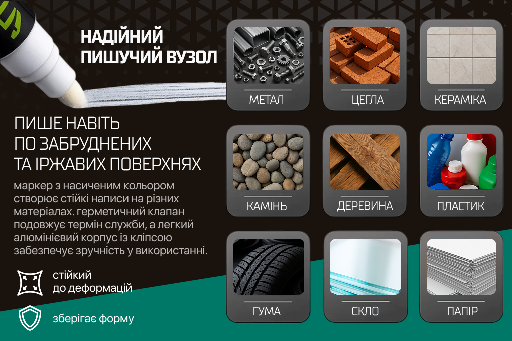 Будівельний маркер на масляній основі створює чіткі й стійкі написи навіть на забруднених та іржавих поверхнях. Підходить для розмітки на металі, цеглі, кераміці, камені, деревині, пластику, гумі, склі та папері. Насичений колір добре видно у будь-яких умовах, а водостійке чорнило швидко висихає і не змивається. Завдяки герметичному клапану маркер служить довше, а легкий алюмінієвий корпус із кліпсою зручний для роботи на будівництві, у майстерні чи вдома.